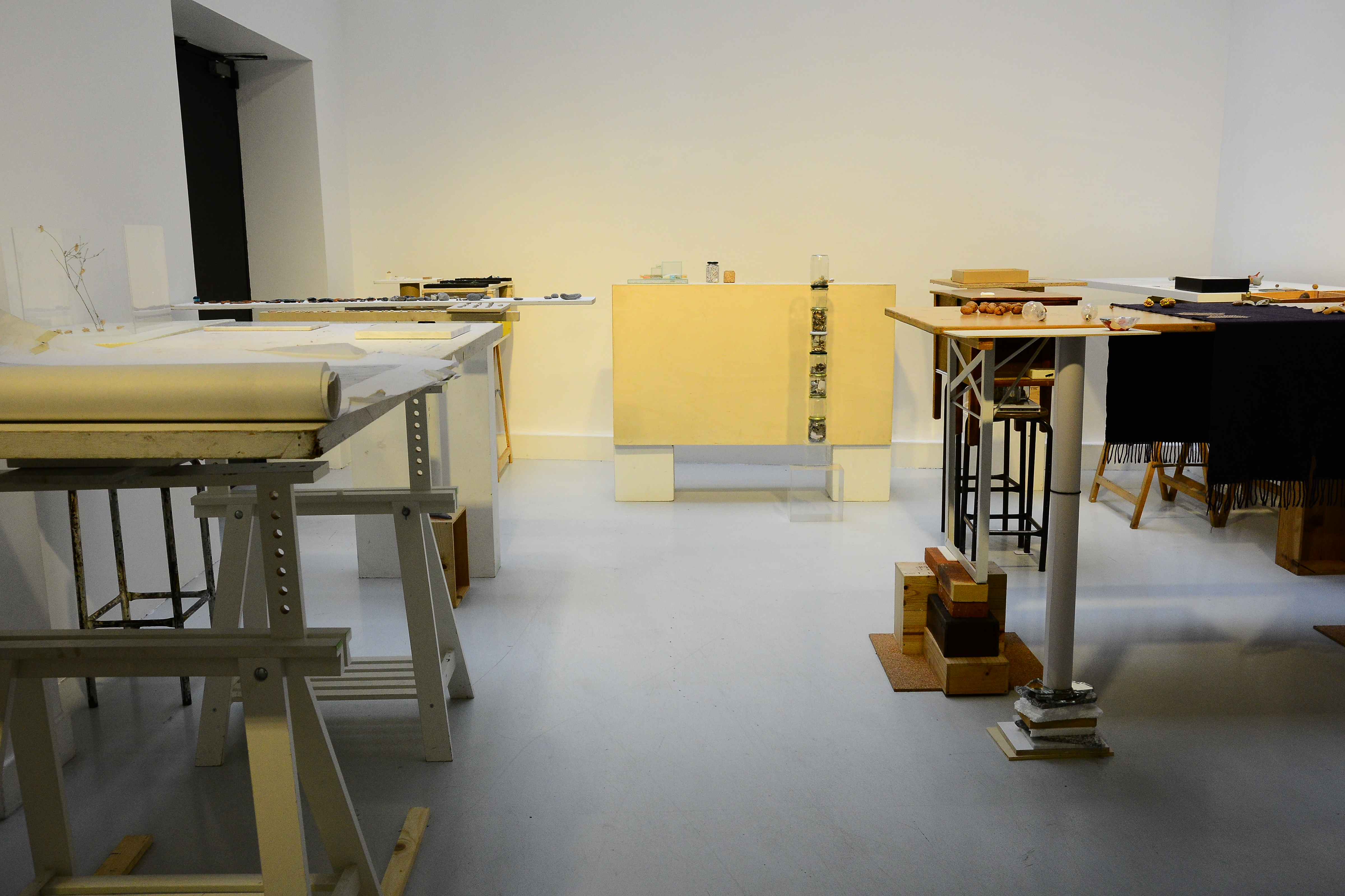 Matériaux divers - Septembre 2017 - Exposition des lauréats des prix des amis des Beaux-Arts de Paris - agnès b. - Paris - France1.10: la hauteur idéale pour appréhender mes objets est celle de mon bureau quand j’ysuis assise. Je surélève la surface pour conserver ce point de vue en étant debout.